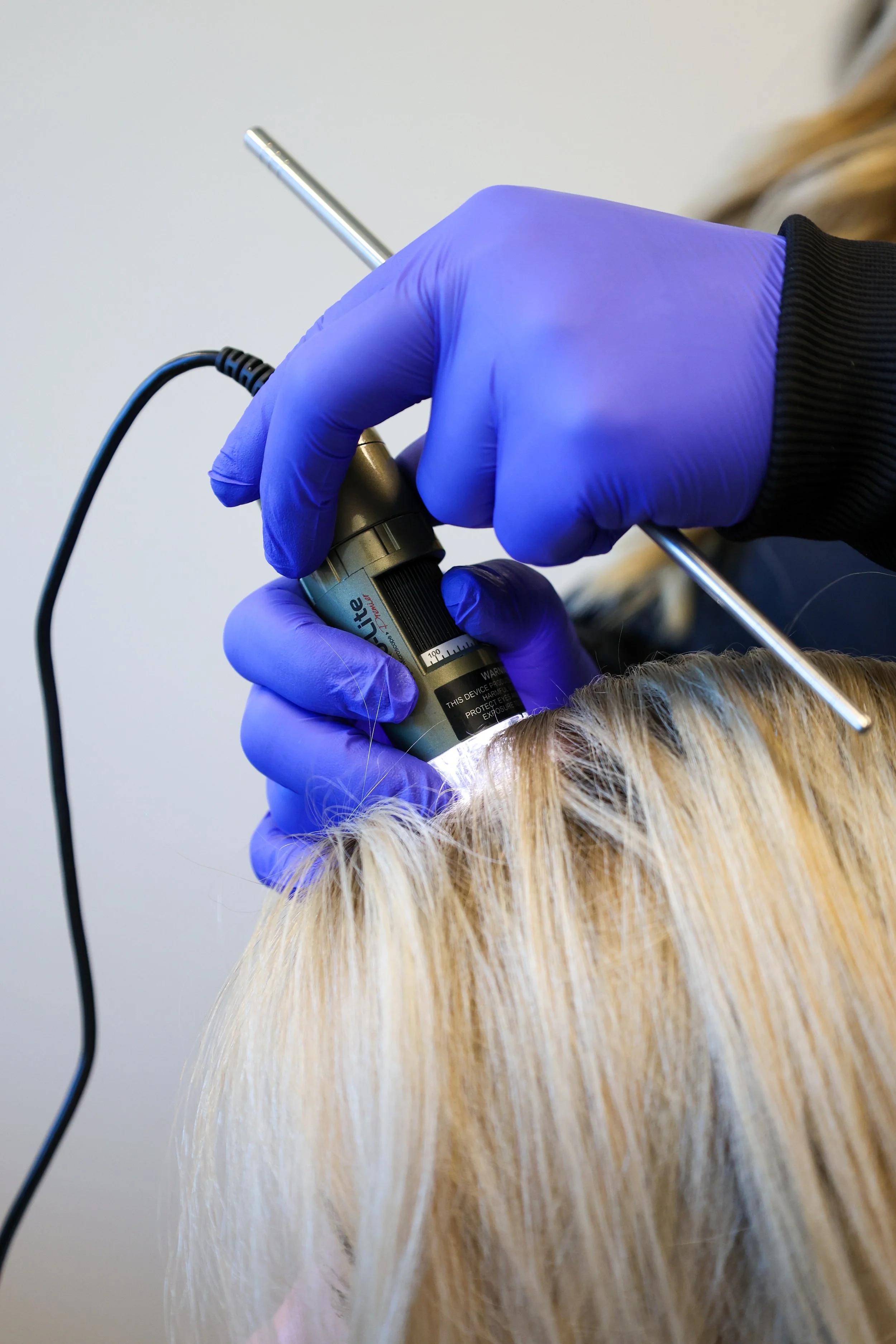 Using advanced polarized light microscopy at up to 200x magnification, we can examine the scalp and hair to identify conditions like excess oil, dryness, and fungal activity, as well as diagnose various hair and scalp loss issues. This level of visualization provides valuable insights into the underlying health of follicles and the scalp.